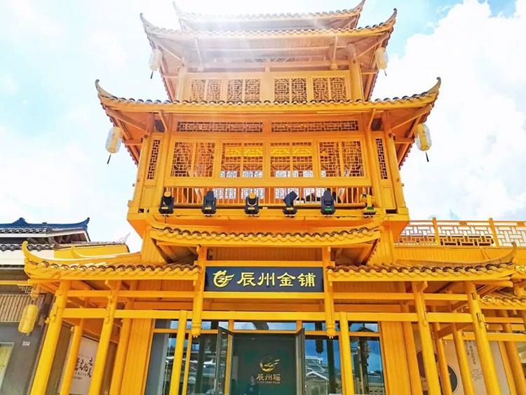 黄金楼处于综合体中心位置,设计融合了传统金矿元素与中国古建筑美学,在阳光下呈现温暖金色,夜晚则在灯光照射下成为璀璨地标。其醒目的金色外观让人过目难忘,被市民和游客亲切地称为“黄金楼”。